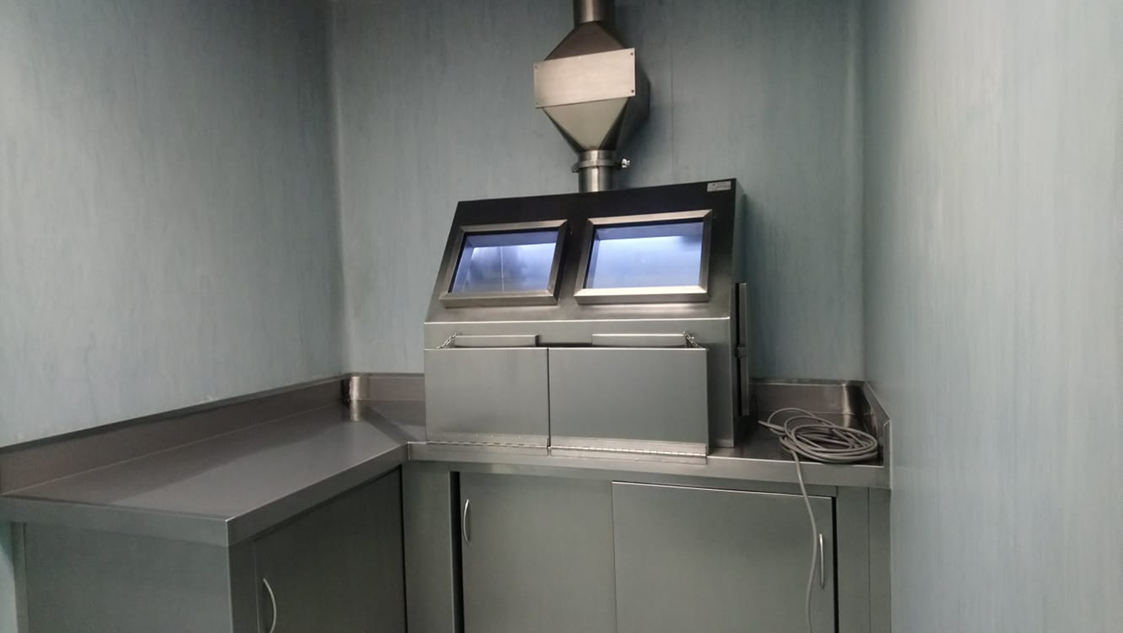Cabina blindada con plomo espesor de 50 mm en todo las paredes tanto inferior y superior. Con vidrios emplomadas resistente a la radiación , Y can enchaquetado con plancha de acero inoxidable tanto interno como externo.